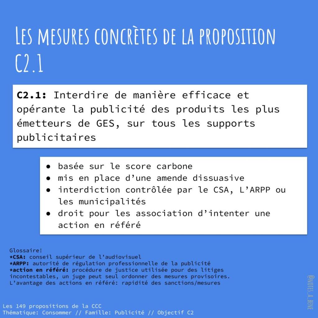 - proposition C2.1: Interdire de manière efficace et opérante la publicité des produits les plus émetteurs de GES, sur tous les supports publicitaires.