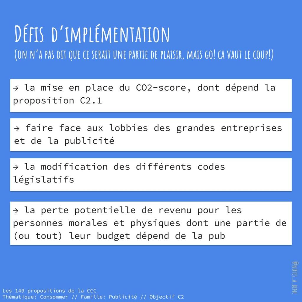 La plus grande difficulté pour mettre en place cette proposition, c’est qu’elle est dépendante de la réalisation de l’objectif C1 – celui de mettre en place un score carbone pour tous les produits et services, puisqu’il est nécessaire d’avoir une méthode pour déterminer quels produits devront être soumis à une publicité régulée et/ou interdiction.